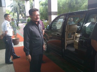 GUBERNUR - Gubernur Sulsel, Syahrul Yasin Limpo saat akan meninggalkan Menara Global, Jl Gatot Subroto, Jakarta Selatan untuk menuju gedung Trans Studio, Jl Kapt Pierre Tendean, Jakarta Selatan, Rabu (26/2/2013).