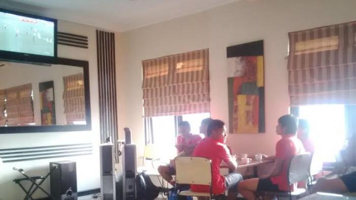 TRIBUN-TIMUR.COM - Sembari menunggu waktu keberangkatan ke Stadion Maguwoharjo,Sleman, para pemain PSM Makassar menyempatkan diri menyaksikan laga timnas U-19 melawan timnas Vietnam U-21 di televisi restoran Hotel Wisanti.