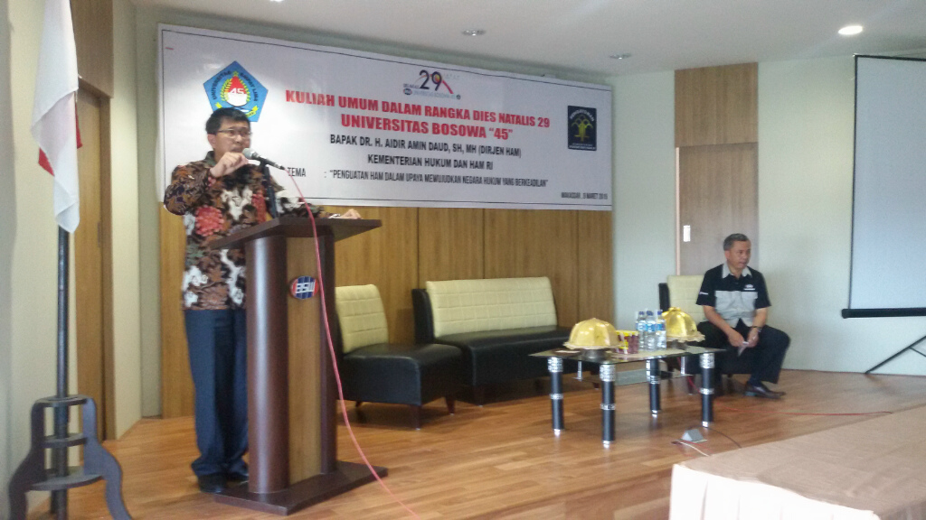 Hal tersebut disampaikan Dirjen Hak Asasi Manusia (HAM), Kementerian Hukum dan HAM Republik Indonesia, Dr Aidir Amin Daud MH saat menjadi pembicara dalam kuliah umum di Universitas Bosowa (Unibos) Makassar, Senin (9/3/2015).