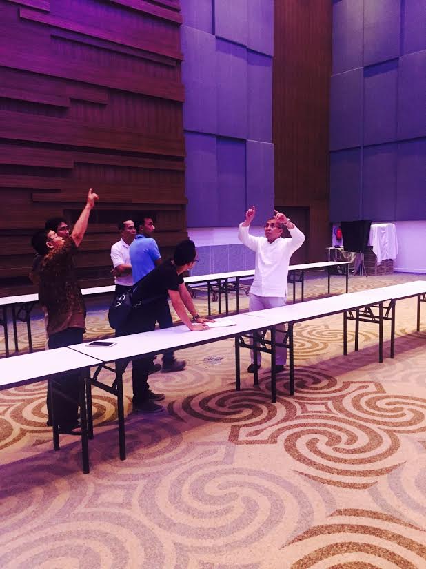 Danny Pomanto dan Aspiannoer membicarakan konsep dan tata letak bangku dan meja untuk Wali Kota se ASEAN yang bakal hadir, 8-12 September 2015