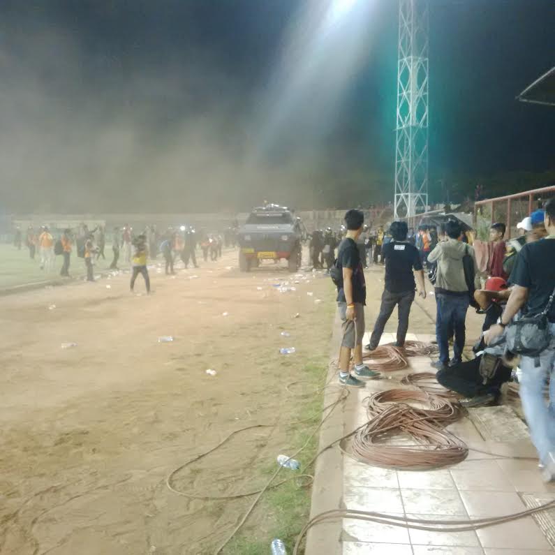 TRIBUN TIMUR.COM, MAKASSAR - Untuk mengatasi kericuhan usai pertandingan PSM Makassar melawan Mitra Kukar, petugas kepolisian menembakkan gas air mata di Stadion Mattoanging Andi Mattalatta .