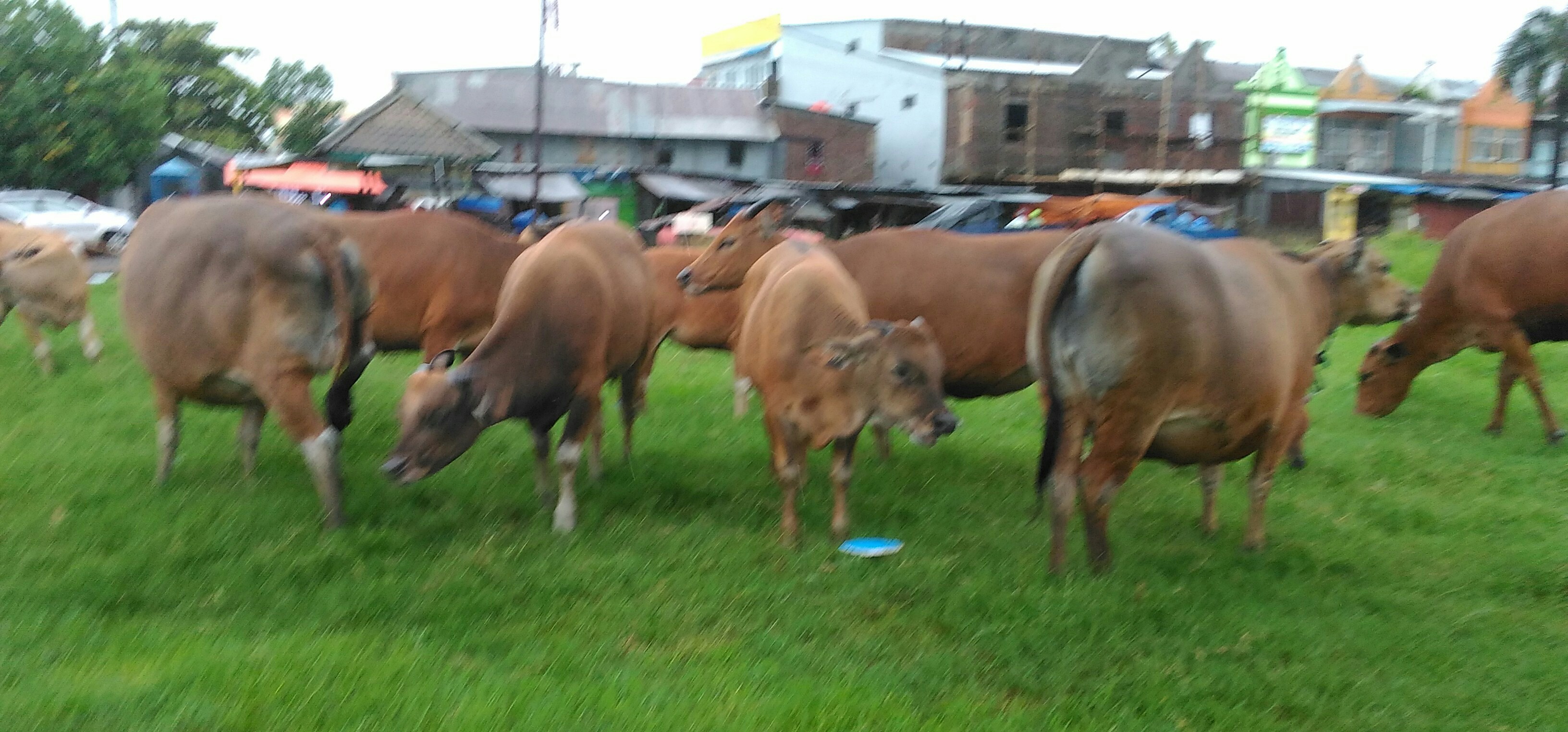 Walau beberapa ekor di antaranya, sesekali menghampiri penjual pisang, yang tak cukup 10 meter dari lahan rombongan sapi berkumpul.