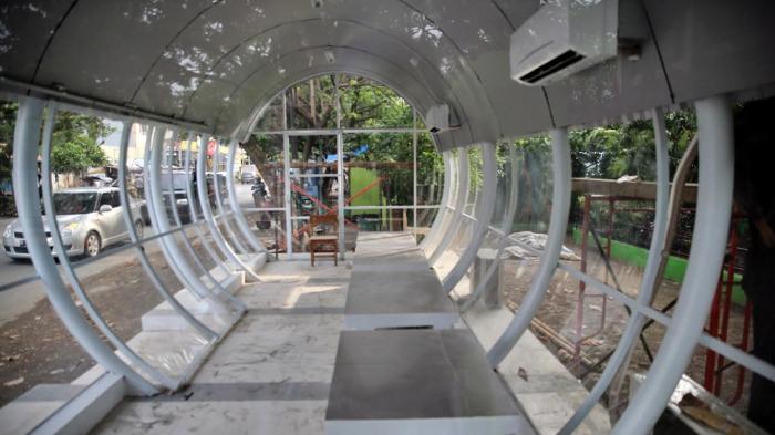 Halte berbentuk tabung ini dilengkapi tempat duduk tang memadai, AC dan pencahayaan.