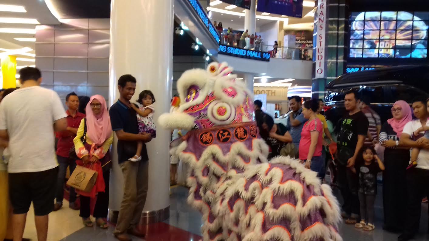 Pengunjung mal Trans Studio Makassar (TSM) memadati area lower ground , Sabtu (6/2/2016) sore, melihat pertunjukan barongsai .
