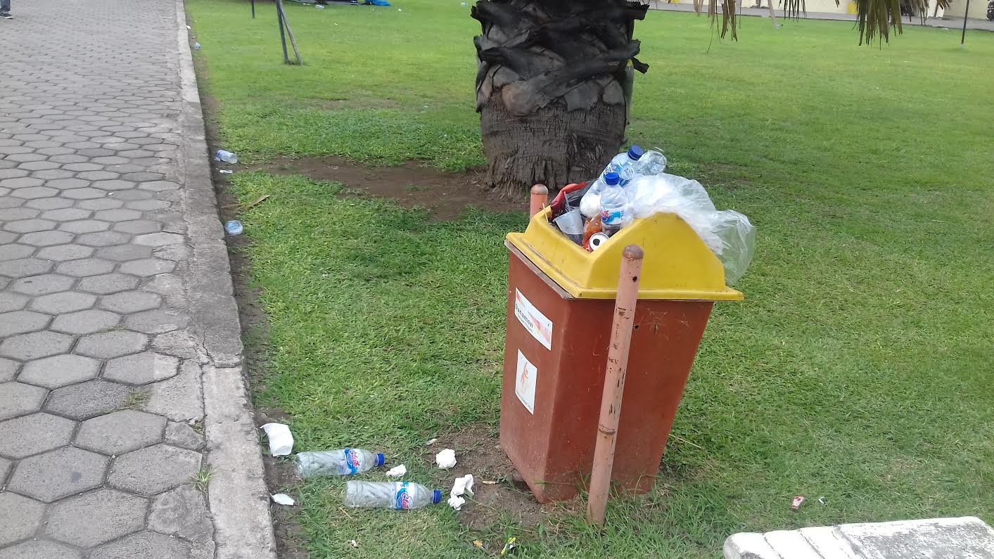 Sejumlah tempat sampah nampak penuh dan botol minuman tercecer ke rumput.