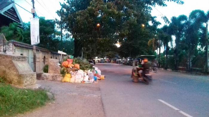 Gunungan sampah yang terdiri dari sampah plastik dan dedaunan tersebut menghiasi pinggiran jalan.