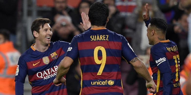 Tiga penyerang Barcelona, Lionel Messi, Luis Suarez, dan Neymar, melakukan selebrasi usai membobol gawang Celta Vigo di Stadion Camp Nou, Minggu (14/2/2016) waktu setempat.