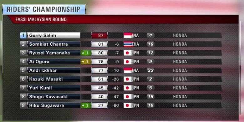 Gilang dan Gerry bersaing ketat dengan beberapa pebalap, yaitu Masaki, Ai Ogura (Jepang), Yuki Kunii (Jepang), Somkiat Chantra (Thailand), dan Yamanaka.