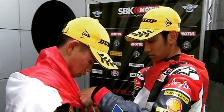 [Pebalap Indonesia, Andi "Gilang" Farid Izdihar (kanan), memasang bendera Merah Putih kepada kompatriotnya, Gerry Salim, jelang podium balapan pertama seri ketiga Asia Talent Cup 2016 di Sirkuit Sepang, Malaysia, Sabtu (14/5/2016). FOTO: KOMPAS.COM/HAND OVER]