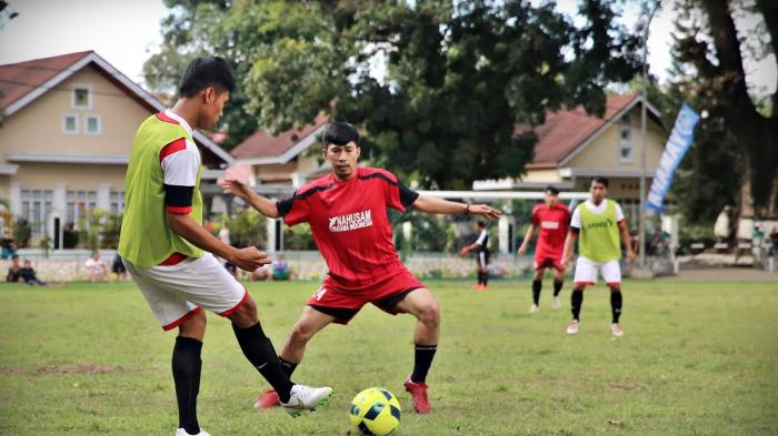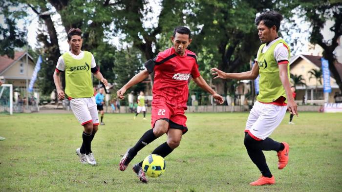 TRIBUN-TIMUR.COM - Pemain Bank Sulselbar berebut bola dengan pemain PLN dalam lanjutan liga ramadan di lapangan Hasanuddin jalan Jendral Sudirman Makassar, Minggu (5/6/2016).