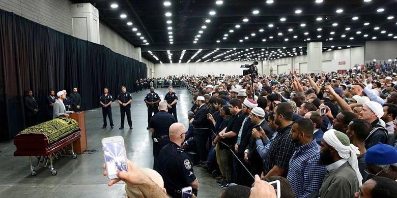 TRIBUN-TIMUR.COM, LOUISVILLE— Ribuan anggota jemaah khusyuk mendoakan jenazah petinju legendaris dan pejuang kemanusiaan, Muhammad Ali, dalam ibadah shalat jenazah di Freedom Hall Arena, Louisville, Kentucky, Kamis (Jumat WIB).