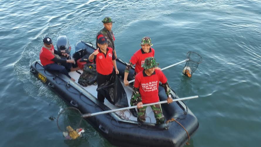 Selain sampah di sekitar anjungan, para alumni juga turun ke laut menggunakan perahu karet untuk membersihkan sampah yang dibuang oleh masyarakat.