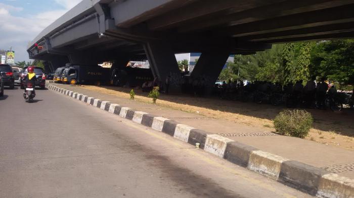 TRIBUN-TIMUR.COM, MAKASSAR - Puluhan aparat kepolisian nampak berjaga di bawah jembatan Fly Over Jl Urip Sumohadjo Makassar.