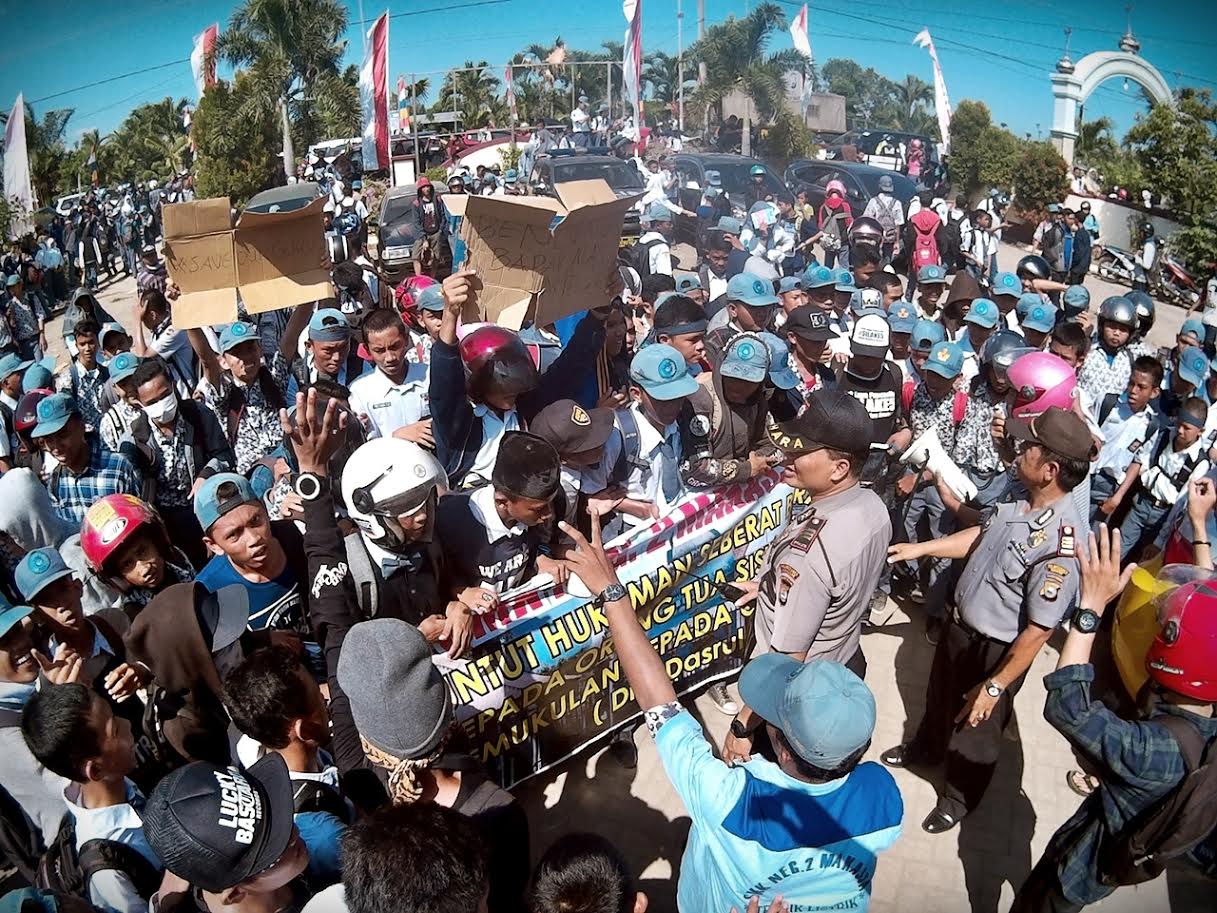 Ratusan siswa dan guru dari SMKN 2 Makassar menggelar aksi di Polsek Tamalate sebagai bentuk simpati terhadap guru yang dipukul orangtua siswa, di Polsek Tamalate di Jl Danau Tanjung Bunga, Kamis (11/8/2016)