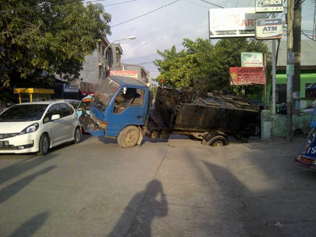 Ban belakang sebelah kiri truk tangki itu terperosok ke selokan. Akibatnya, arus lalu lintas kendaraan sempat mengalami kemacetan