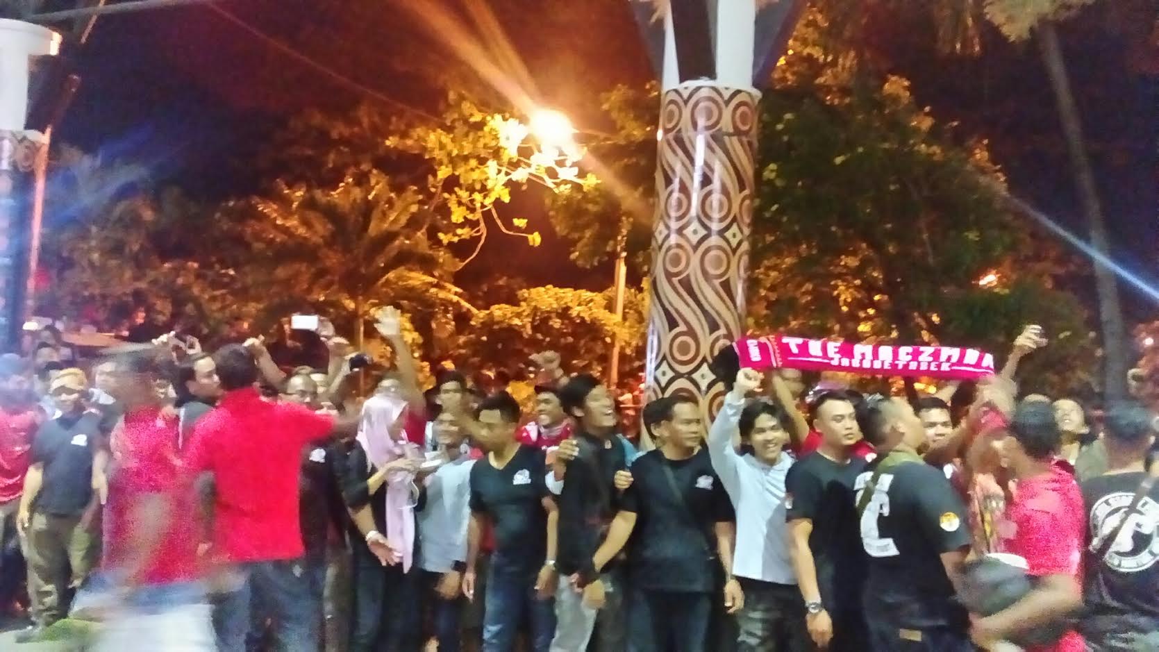 Puluhan suporter sudah menunggu Syamsul cs di depan stadion. Sesaat para pemain keluar, suporter langsung bersorak dan bernyanyi.