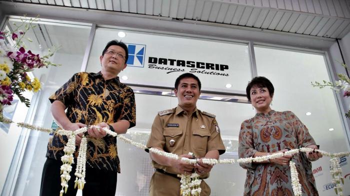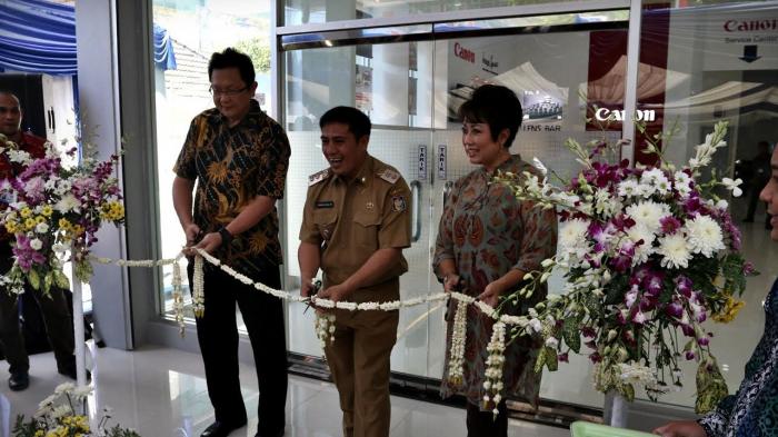 TRIBUN-TIMUR.COM -Division Director PT Datascrip Merry Harun (kanan), Direktur Laayanan Purnajual Budianto Iskandar (kiri) dan Wakil Walikota Makassar Syamsu Rizal memotong pita pada peresmian Canon Image Square dan Datascrip showroom di Makassar, Selasa (6/9). tribun timur/muhammad abdiwan