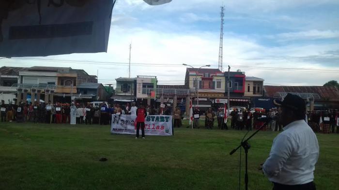 TRIBUNLUWU.COM, BELOPA - Wakil Bupati Luwu Amru Saher melepas peserta napak tilas di Lapangan Opu Dg Risaju, di Kelurahan Tampumia Radda, Kecamatan Belopa, Kabupaten Luwu, Rabu (9/11/2016).