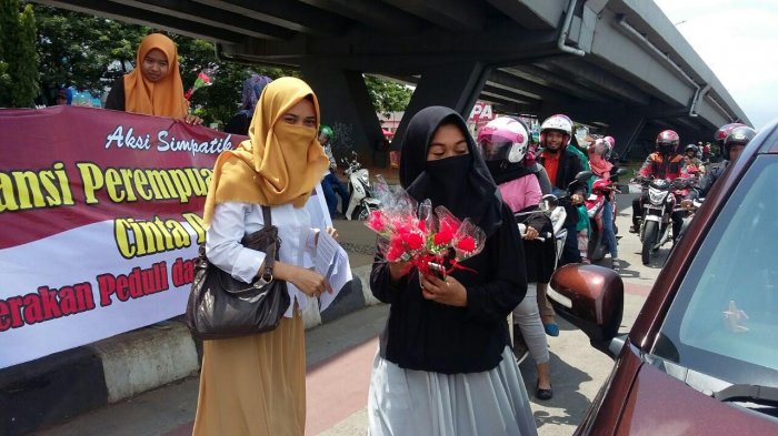 TRIBUN-TIMUR.COM, MAKASSAR - Belasan mahasiswi yang tergabung di Aliansi Perempuan Makassar Cinta Damai membagi-bagikan bunga Mawar Merah di Flyover, Sabtu (19/11/2016).