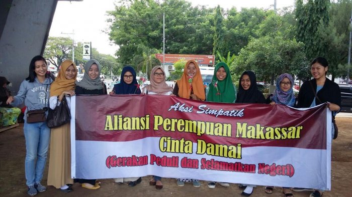 TRIBUN-TIMUR.COM, MAKASSAR - Belasan mahasiswi yang tergabung dalam Aliansi Perempuan Makassar Cinta Damai menggelar demo dibawah Flyover Makassar, Sabtu (19/11/2016).