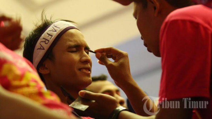 TRIBUN-TIMUR.COM-Kemeriahan perayaan HUT Hotel santika yang ke 10 tahun berlangsung di hotel tersebut, di Jl Sultan Hasanuddin, Makassar, Jumat (20/1/2017). Dalam acara ini manjemen Hotel Santika Makassar menggelar lomba merias wajah antar karyawan laki-laki dan beberapa hiburan lainnya.TRIBUN TIMUR/SANOVRA JR