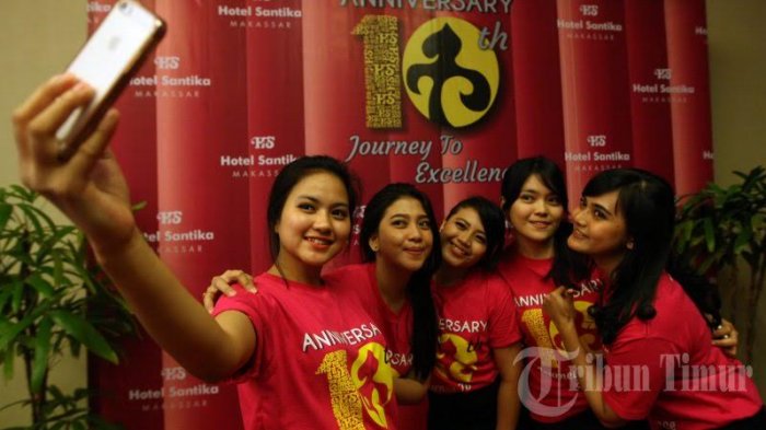 Kemeriahan perayaan HUT Hotel santika yang ke 10 tahun berlangsung di hotel tersebut, di Jl Sultan Hasanuddin, Makassar, Jumat (20/1/2017). Dalam acara ini manjemen Hotel Santika Makassar menggelar lomba merias wajah antar karyawan laki-laki dan beberapa hiburan lainnya.