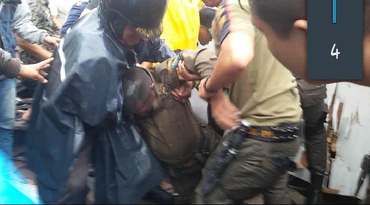TRIBUN-TIMUR.COM, SUNGGUMINASA- Satu anggota Satpol PP Gowa tertimpa bangunan tribun Lapangan Syekh Yusuf, Jumat (3/2/2017).