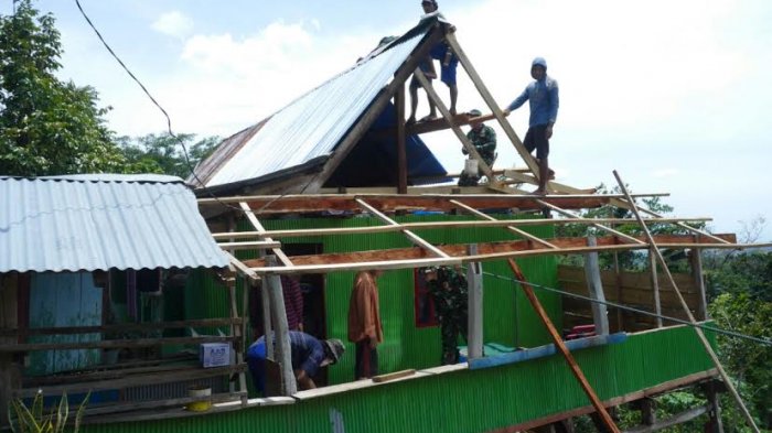 TRIBUNBANTAENG.COM, BANTAENG - Sebanyak 70 personel Kodim 1410 dan puluhan anggota Polres Bantaeng membangun kembali rumah warga yang rusak diterjang angin kencang, Kamis (9/2/2017).