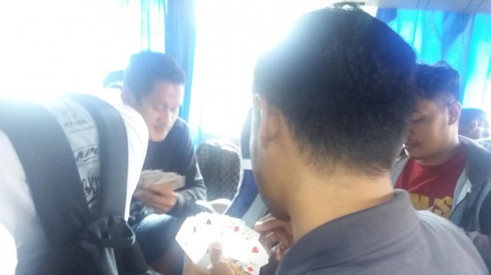 Untuk mengatasi kebosanan dalam perjalanan yang cukup melelahkan tersebut, para pemain bermain kartu di dalam bus.