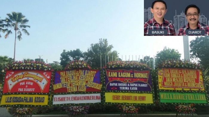 "Pak Basuki dan Pak Djarot tak terlihat kesedihan, namun tetap tersenyum dan bersyukur. Terima kasih," bunyi tulisan di salah satu karangan bunga di Balai Kota. Karangan bunga itu dikirim oleh Elisabeth, Endah, Entin, dan Erlina.
