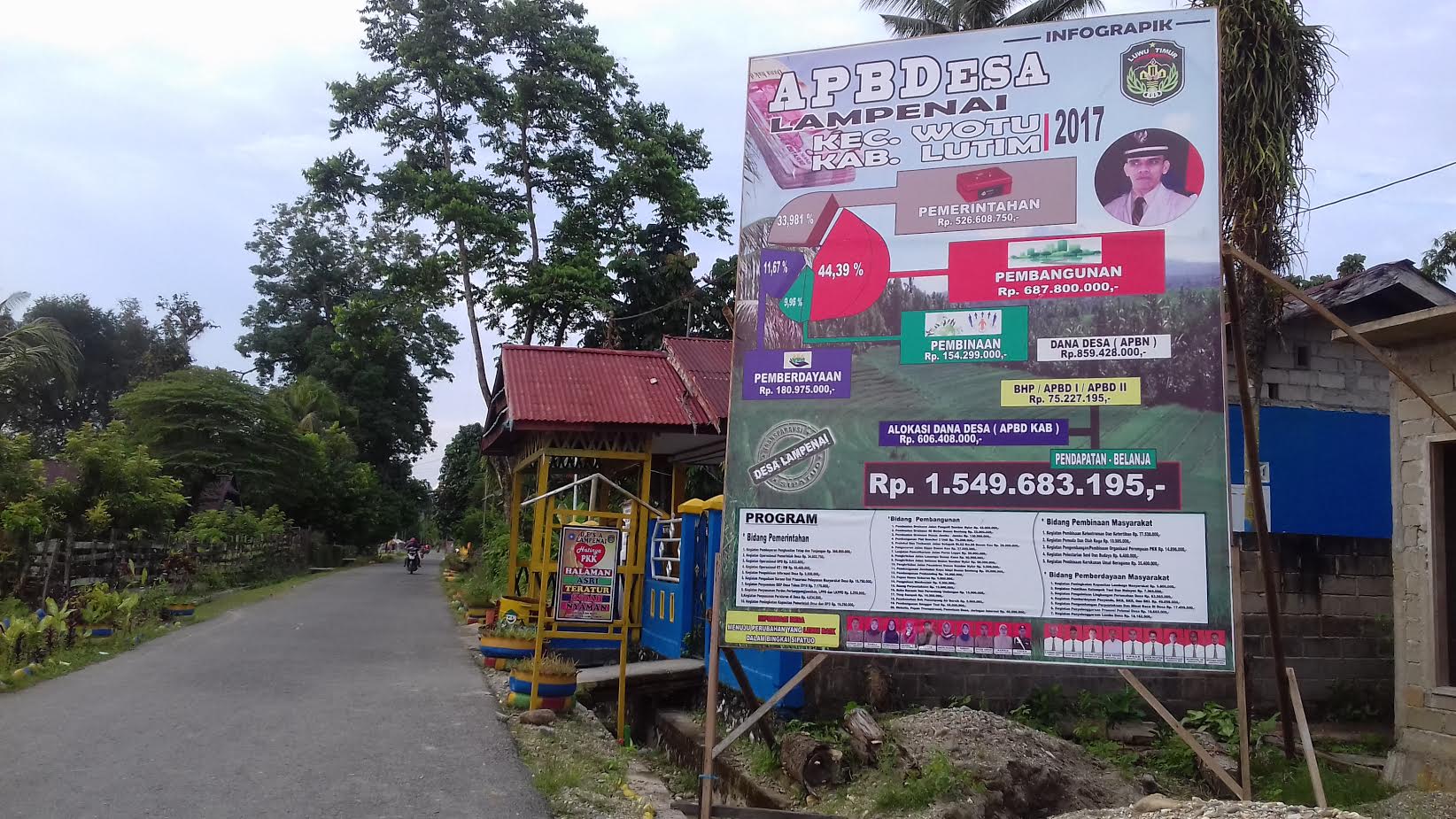 TRIBUNLUTIM.COM, WOTU - Baliho infografik penggunaan anggaran dana desa (ADD) dan dana desa 2017, Desa Lampenai, Kecamatan Wotu, Luwu Timur dipasang dipinggir jalan.