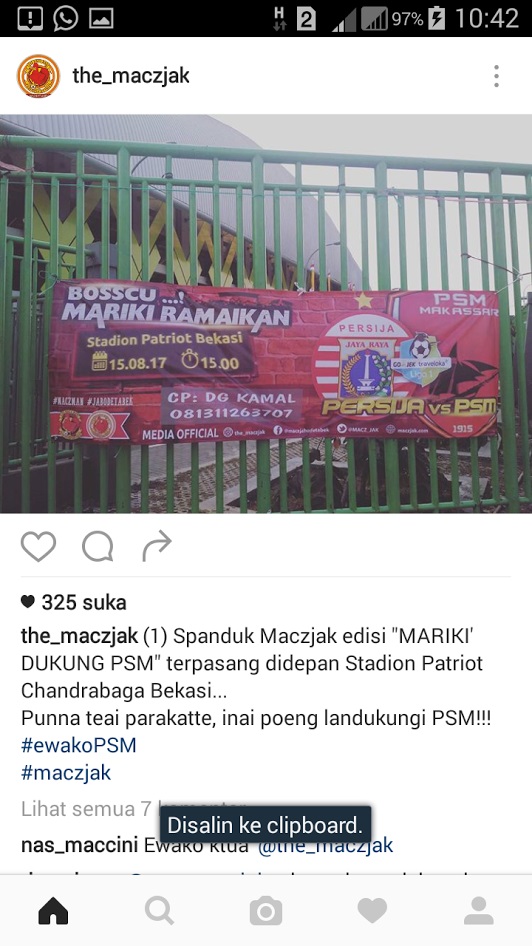 Dalam akun Instagram Maczjak tertulis keterangan gambar yakni "Spanduk Maczjak edisi "Mariki Dukung PSM" terpasang di depan Stadion Patriot Chandrabaga, Bekasi. Punna Teai Parakatte, Inai Poeng Landukungi PSM," tulis admin dalam akun instagram tersebut.