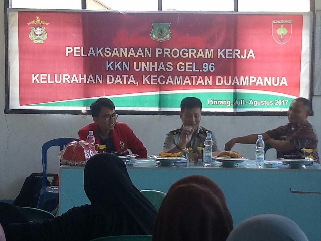 TRIBUNPINRANG.COM, DUAMPANUA - Mahasiswa Kuliah Kerja Nyata (KKN) Universitas Hasanuddin (Unhas) Makassar Gelombang 96 menggelar sosialisasi sertifikasi tanah di Kantor Kelurahan Data, Kecamatan Duampanua, Kabupaten Pinrang, Kamis (3/8/2017).