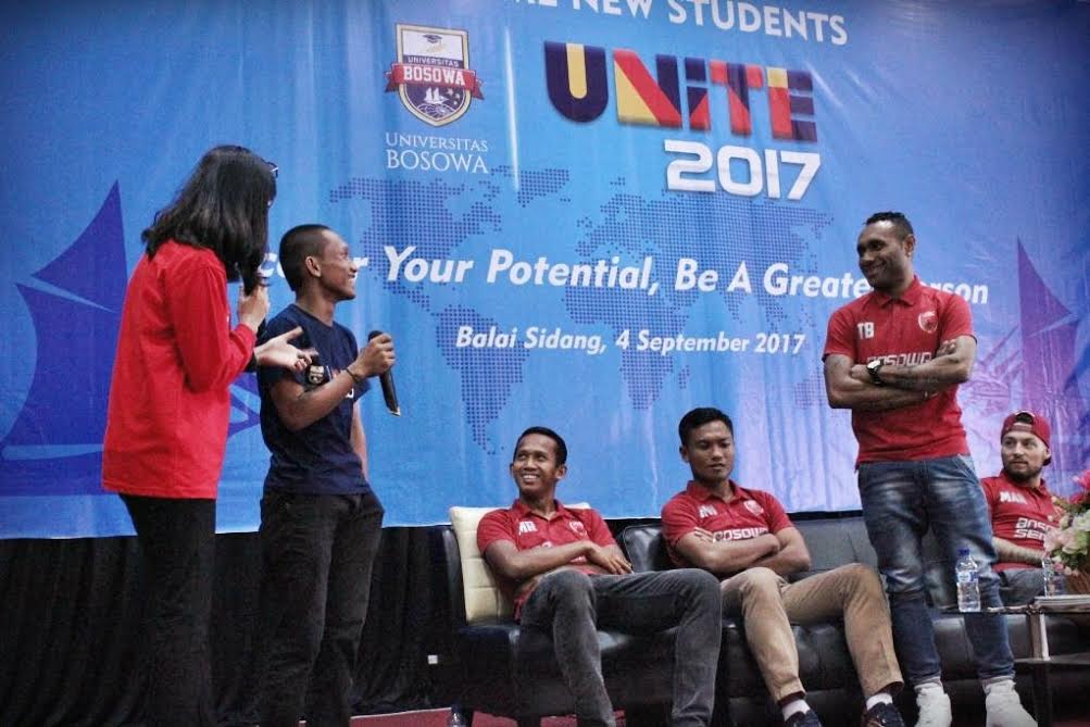 Suasana penyambutan mahasiswa baru Universitas Bosowa di Gedung Balai Sidang Unibos, Jalan Urip Sumoharjo, Senin (4/9/2017). Kegiatan ini berlangsung meriah dengan kedatangan 4 pemain PSM yakni Hendra Wijaya, Titus Bonai, M Rahmat, dan Marc Klok. tribun timur/muhammad abdiwan