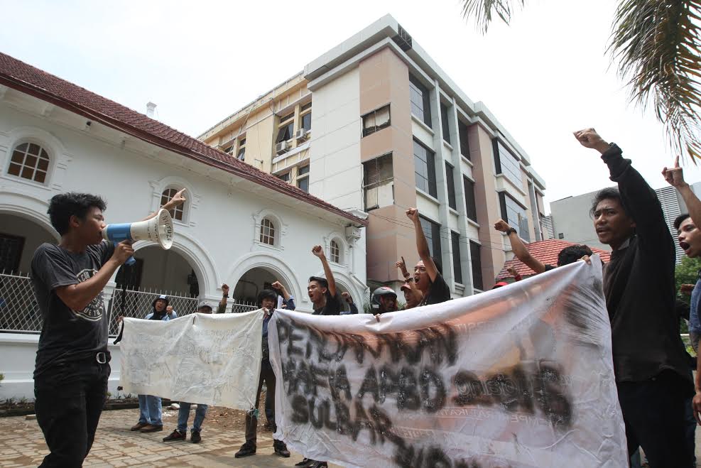 Sembari membentangkan spanduk yang bertuliskan tuntutan mereka, mahasiswa meminta majelis hakim untuk menolak permohonan praperdilan tersangka.