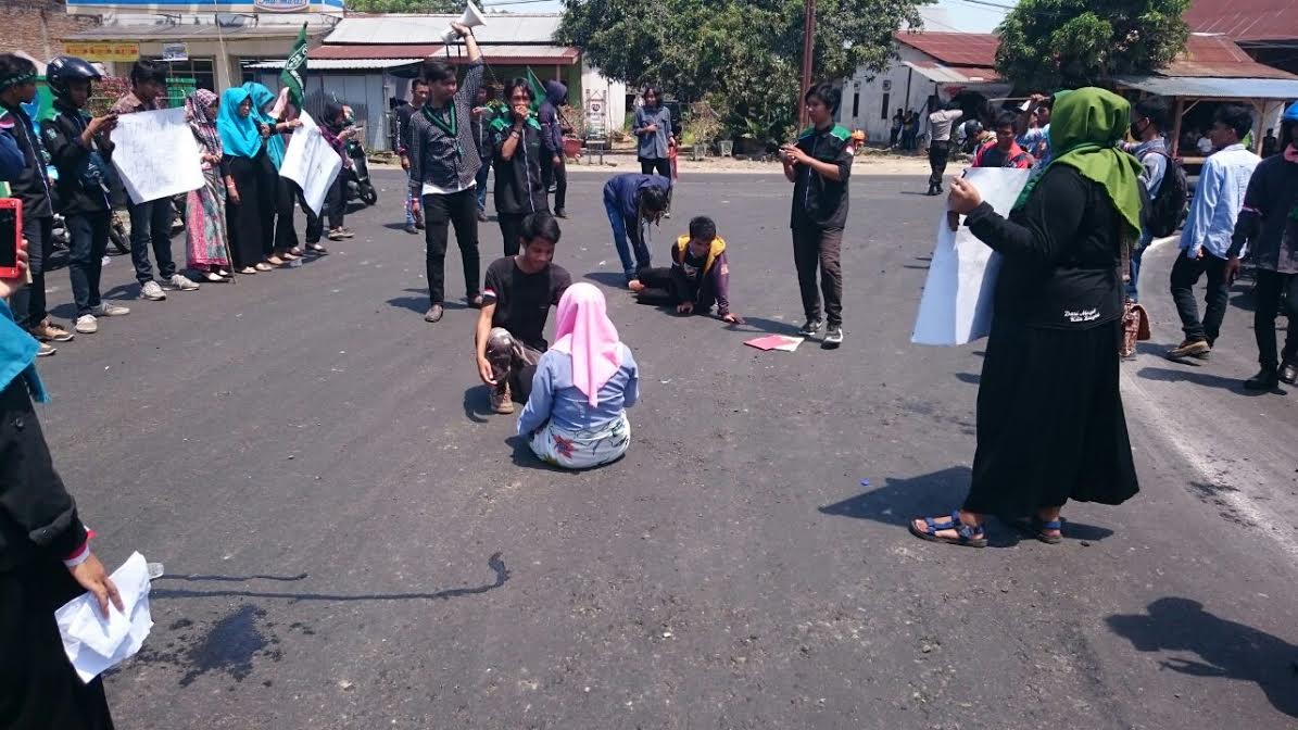 Selain menyampaikan orasi politik, peserta aksi juga tampak melakukan aksi teatrikal, yang menggambarkan kondisi anak muda saat ini.