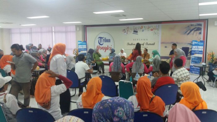 Ketua PKK Makassar, Indira Jusuf Danny Pomanto, bersama tim kreatif narasumber Tribun Nongki di Gedung Tribun Timur Makassar, Jumat (3/11/2017)