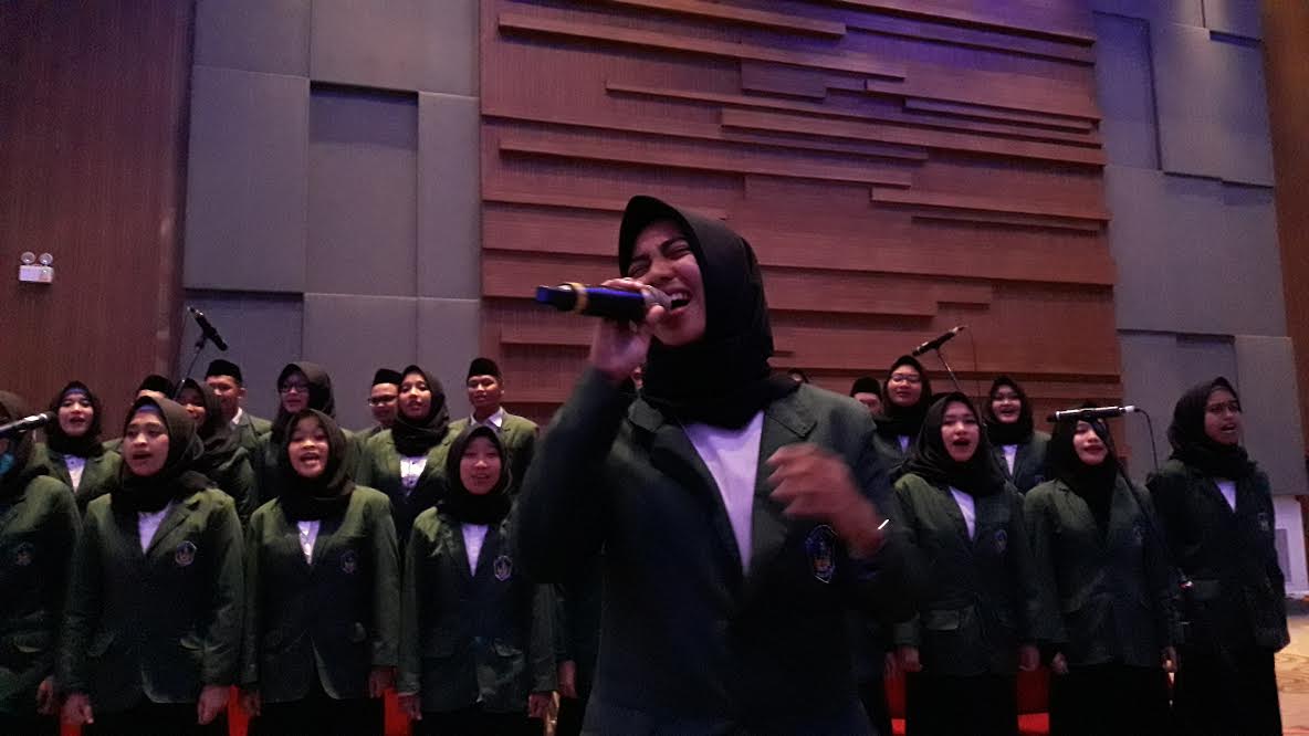 Suara merdu Raskyah Ramadhani Jalante (19), mahasiswi Ilmu Hukum menyita perhatian seisi gedung lewat lagunya pantang mundur.