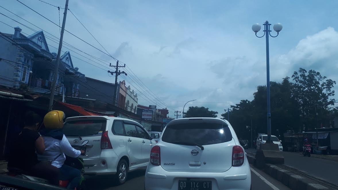 Beberapa mobil parkir di badan jalan depan toko buah Maccopa, pukul 11.44 wita, mengakibatkan kemacetan di jalan poros Maros, Minggu (28/1/2018).