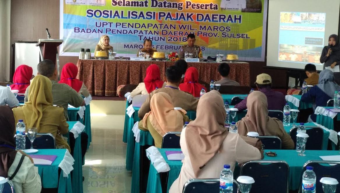 TRIBUN TIMUR.COM, MAROS - Unit Pelaksana Teknis (UPT) Samsat Maros bersama Badan Pendapatan Daerah (Bapenda) Sulsel menggelar sosialisasi pajak daerah di hotel Darma Nusantara, jalan Poros Maros, Senin (5/2/2018).