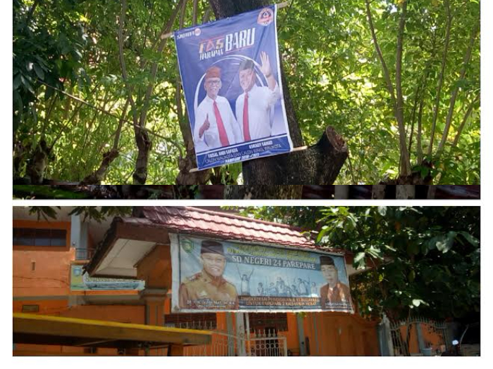 Gambar Paslon ini pun masih terpasang di pohon dan gedung Sekolah Dasar (SD) di jalan Agussalim.