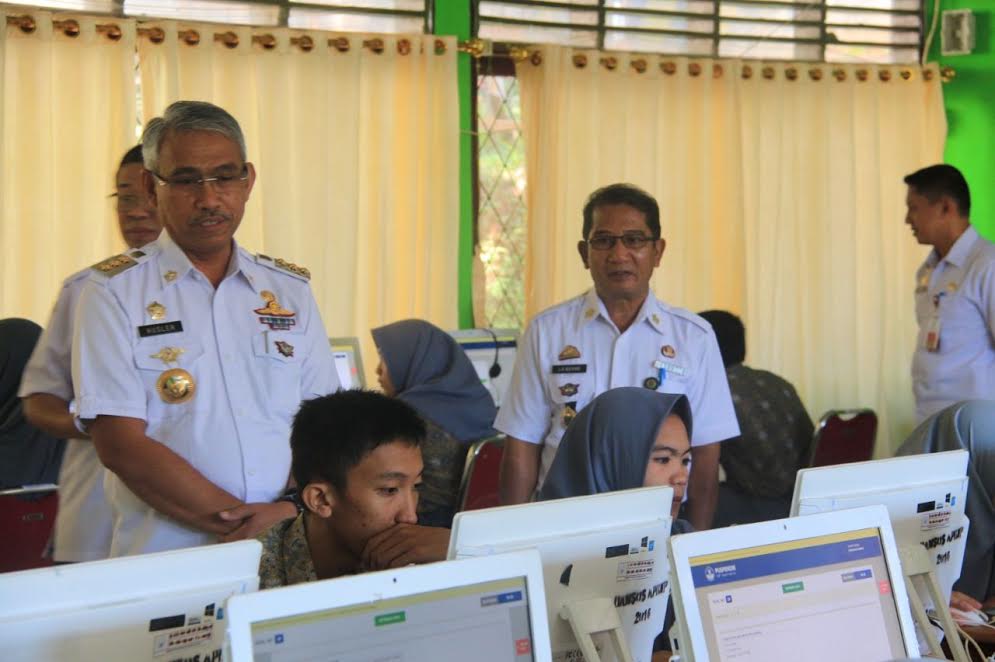 TRIBUNLUTIM.COM, MALILI - Bupati Luwu Timur, Thorig Husler memantau Ujian Nasional Berbasis Komputer (UNBK) mata pelajaran Bahasa Inggris di SMAN 1 Luwu Timur, Jl Montolalu, Kelurahan Malili, Kecamatan Malili, Kabupaten Luwu Timur, Sulawesi Selatan (Sulsel), Rabu (11/4/2018).