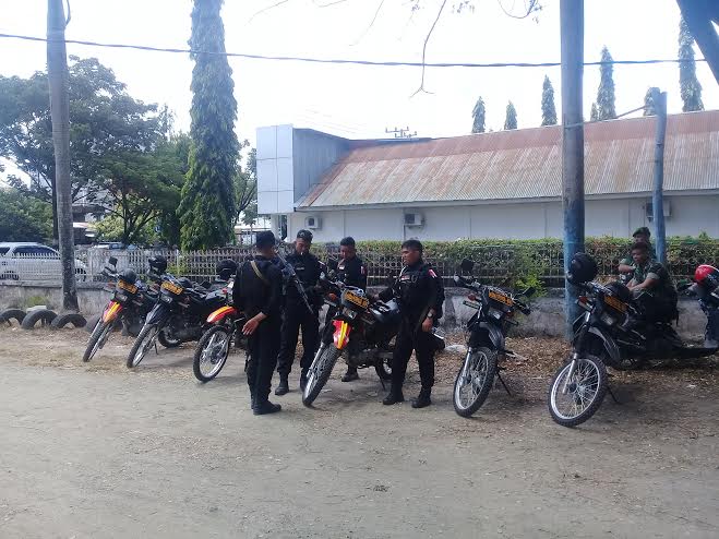 Tampak pula sejumlah anggota Brimob bersenjata lengkap disiagakan di kantor Panwaslu Sidrap.
