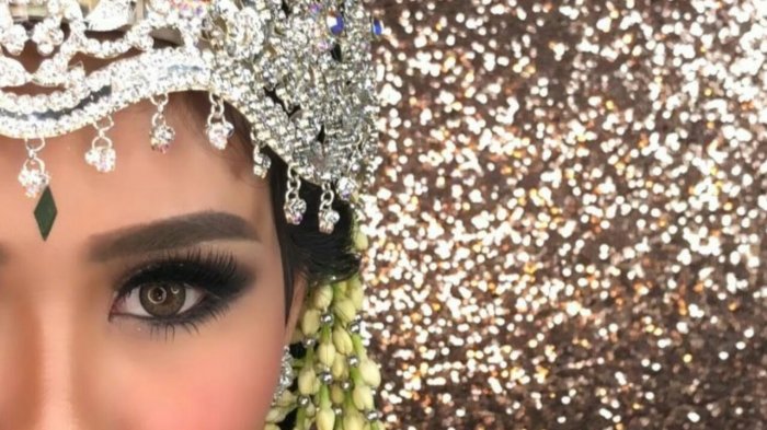 Syahnaz terlihat cantik dengan busana serba putih dan riasan serta pakaian pengantin adat Sunda.