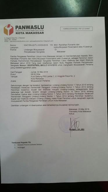 Sementara itu, Kuasa Hukum Munafri Arifuddin-Andi Rachmatiki Dewi, Irfan Idham SH mengatakan saat ini sedang mengajukan surat permohonan ke Panwaslu Kota Makassar sebagai pihak terkait.