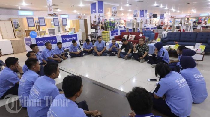 TRIBUN-TIMUR.COM, MAKASSAR - Sejumlah karyawan melakukan meeteng dan persiapan pembukaan toko JYSK di lt 2 mal Panakkukang, Makassar, Kamis (17/5/208).