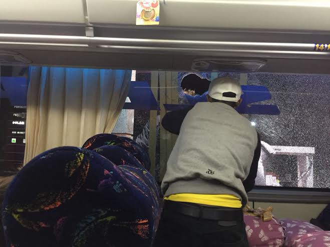 Endhy menuturkan pelaku melempar kaca jendela tepat di kursi nomor 13 dan 14 yang kebetulan diduduki seorang ibu dan bayinya.