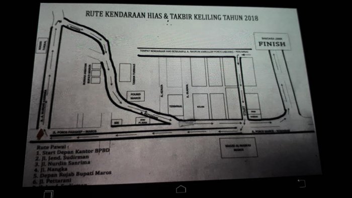 Kabag Humas Pemkab Maros, Darmawati mengatakan, rute pawai takbir star di depan kantor BPBD Jl Asoka, lalu ke Jenderal Sudirman.