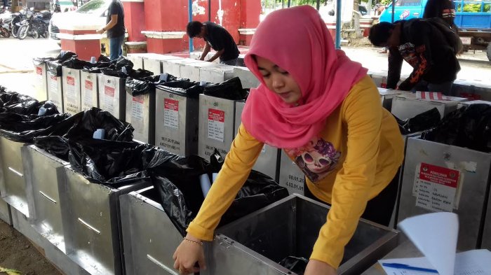 Sebelum pendistribusian, staf KPU Luwu mengepak logistik, mempersiapkan kotak suara beserta isinya, kemudian disegel sebelum dinaikkan ke truk angkutan logistik.