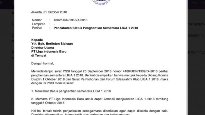 Disampaikan bahwa merujuk hasil sidang komdis 1 Oktober 2018 dam surat permohonan dari Forum Silaturahmi Klub Liga 1 2018, maka dengan ini PSSI memutuskan, pertama mencabut status penghentian sementara Liga 1.